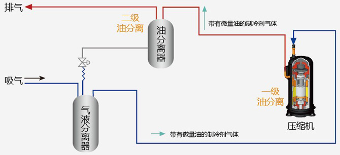日立專有壓縮機具有內部油分離功能,同時在排氣管道路上設置油分離器,實現二次油分離,油分離效果好,保證系統更穩定可靠。